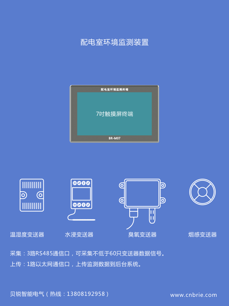 配电室环境监测装置用于监测室内环境温湿度、电缆沟水浸、臭氧浓度、烟雾浓度,监测参数以Modbus-TCP协议上传,也可在本地监测终端显示。