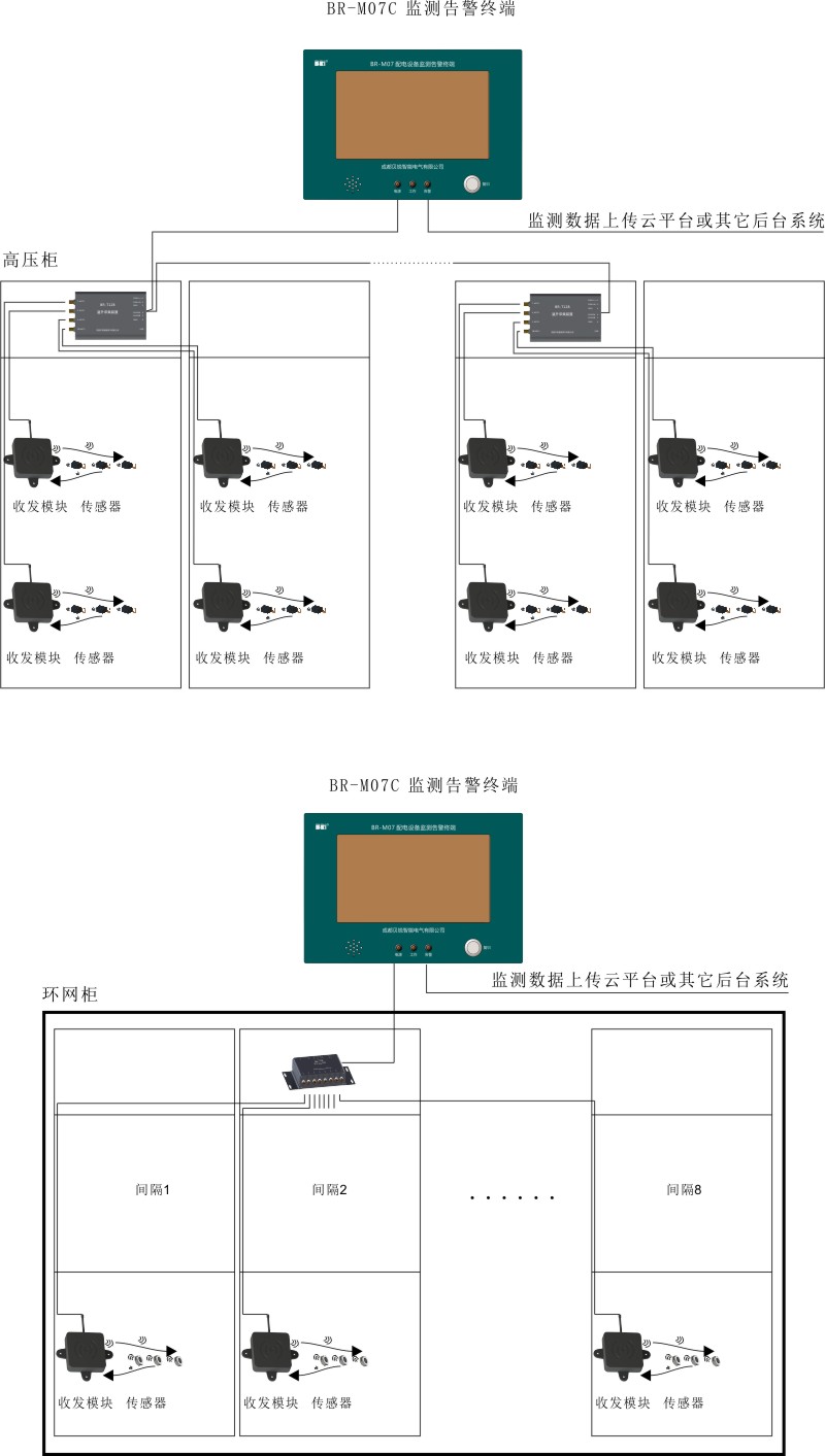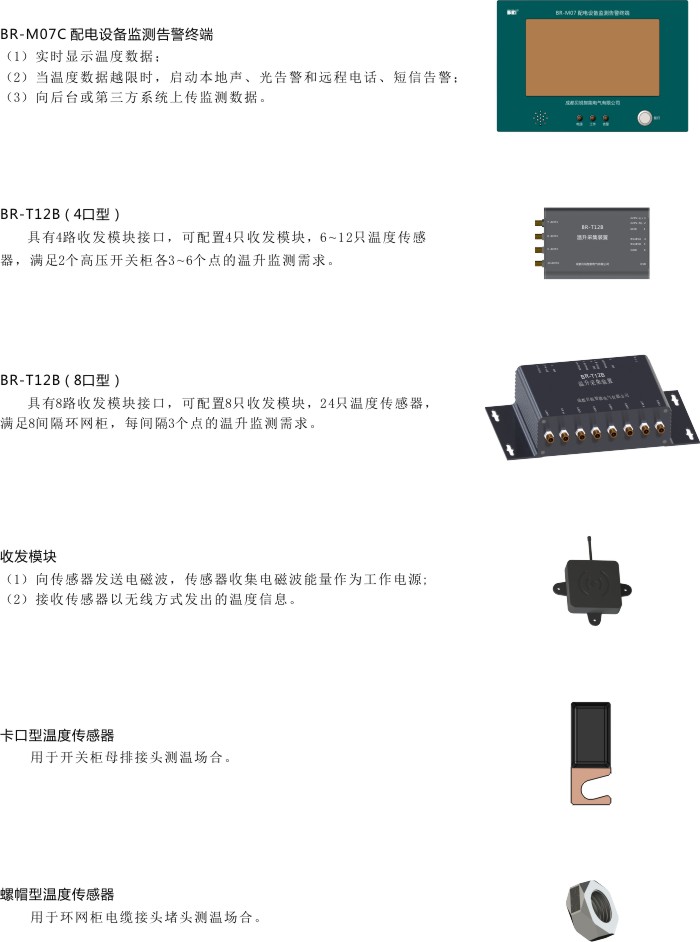 BR-T12B(8口型):用于环网柜温升监测场合,单台BR-T12B(8口型)可满足8间隔环网柜测温需求(每间隔配置收发模块1只,温度传感器3只), 监测数据通过RS485通信电缆上传至BR-M07C监测告警终端,实现温度数值越限告警。